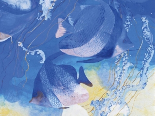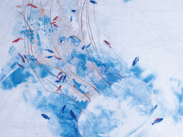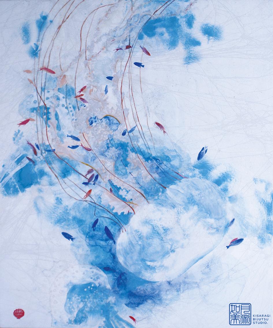 風に揺れる花に大いなる大気の流れを感じ、群れ泳ぐ海の生物には壮大な海流をイメージする。自身の心に秘めた想いを込め制作しています。